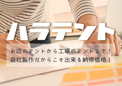 株式会社ハラテントでは、企画から製作・施工まで、自社で行なっています。お客さまのご要望に最大限お応えし、自社製作だからこそ出来る安心の納得価格ときれいな仕上がりをお約束します。お店のテント・看板から工場のテントまで!お気軽にご相談ください。